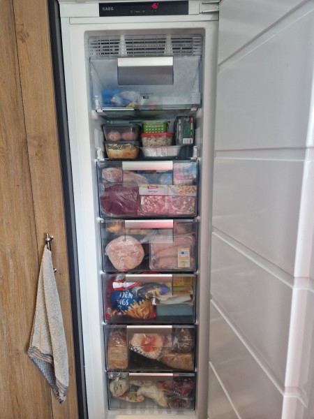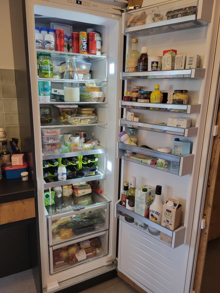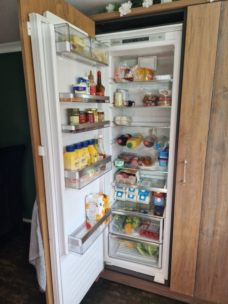 De grote koelkast staat in de bijkeuken en deze is een stuk netter. Daar ligt vooral het avondeten in. Daar komen de meiden nauwelijks en daar wordt vooral eten uitgehaald en weinig weer in terug gelegd.