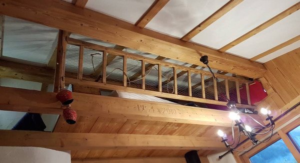 Het is wel echt klein, de kinderen hebben een fatsoenlijk grote slaapkamer met een stapelbed en slaapbank, maar mijn zus en ik slapen op een vide van 150 cm hoog met een kooi en een ladder om erop te klimmen, niet teveel wijn drinken dus… 🤣