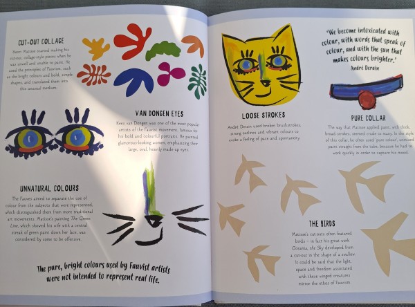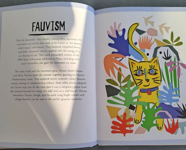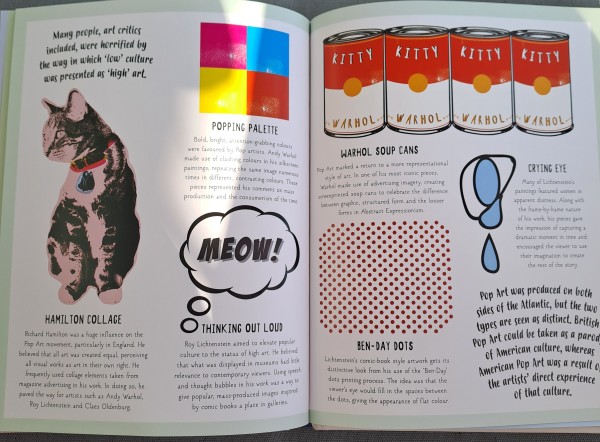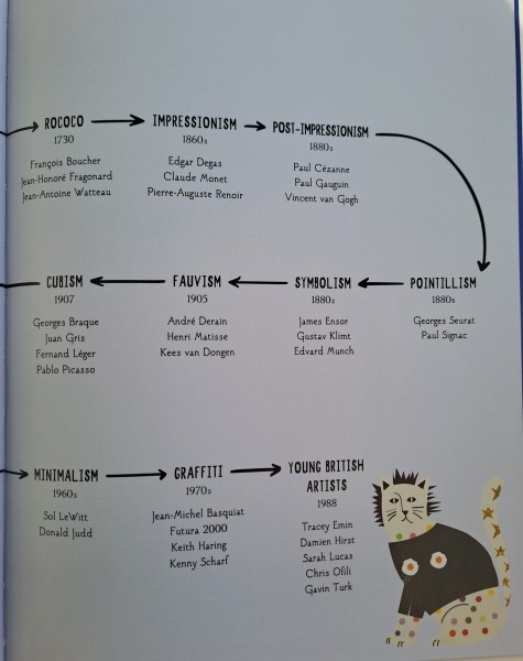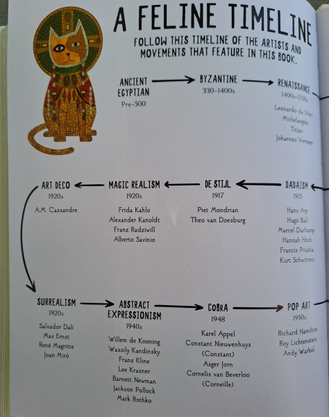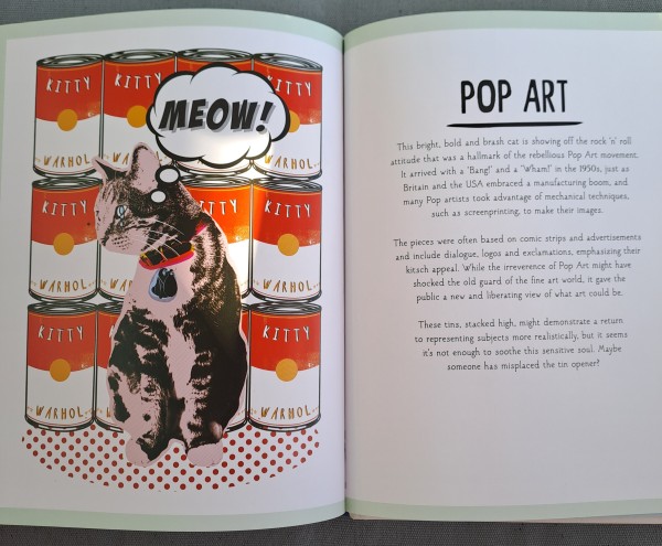 Ieder onderwerp omvat 4 pagina's: 1 met een bekend schilderij in kat-vorm, 1 met wat basis uitleg, en dan 2 pagina's waarin verschillende aspecten uit de stijl ontleed worden, in kat-vorm.